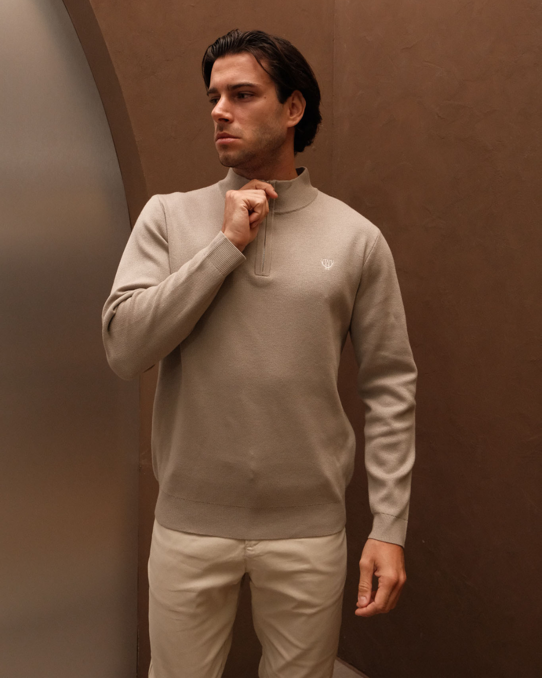 The Classic Half Zip. Brave the elements in style with Walker & Hunt's Half Zip. The Half Zip is a slim fit, 12-gauge, soft knit sweater with an inset sleeve and beautiful 1x1 hem collar and cuff. The Knit pairs comfortably with a shirt and super stretch chino pant.